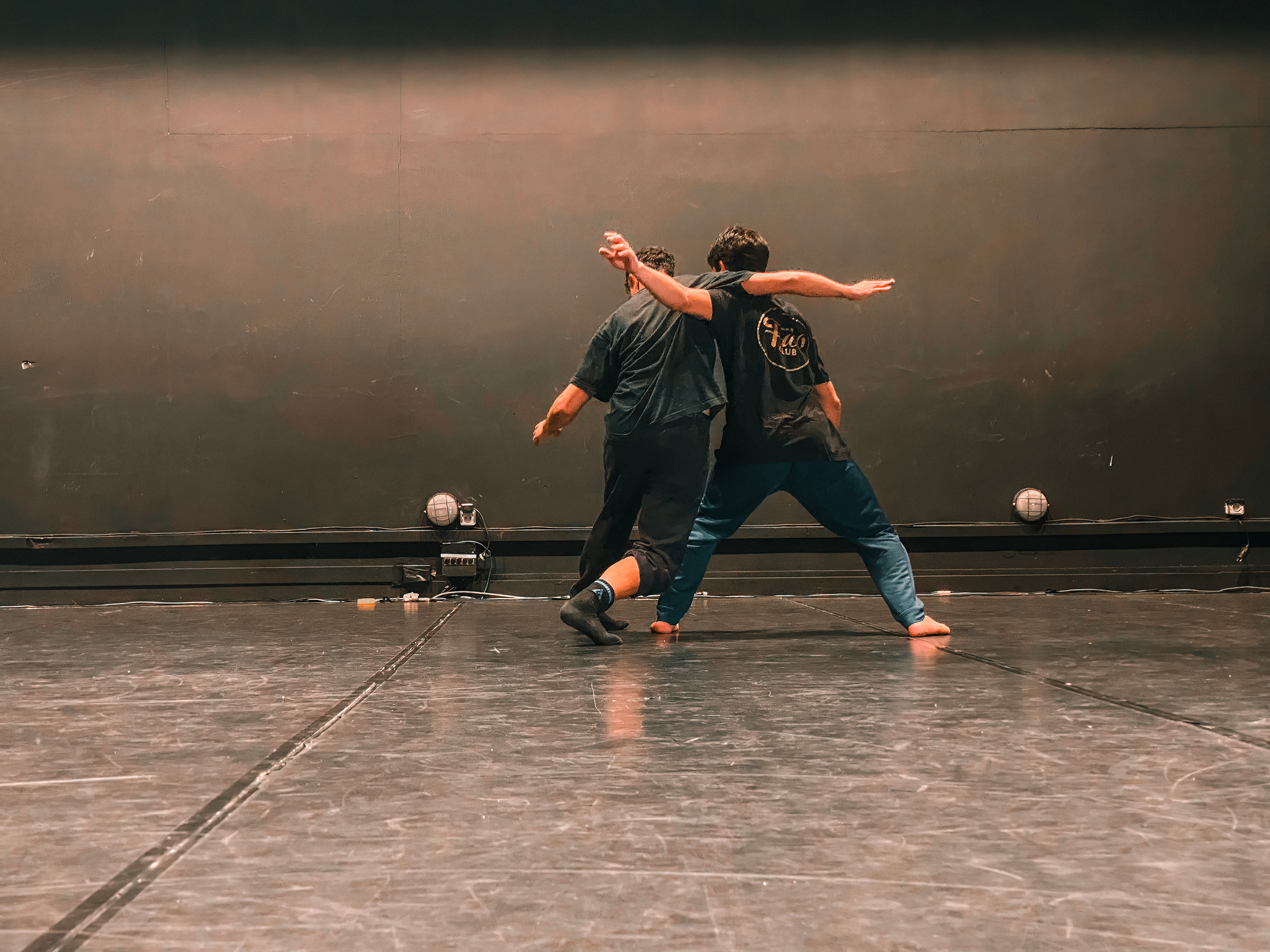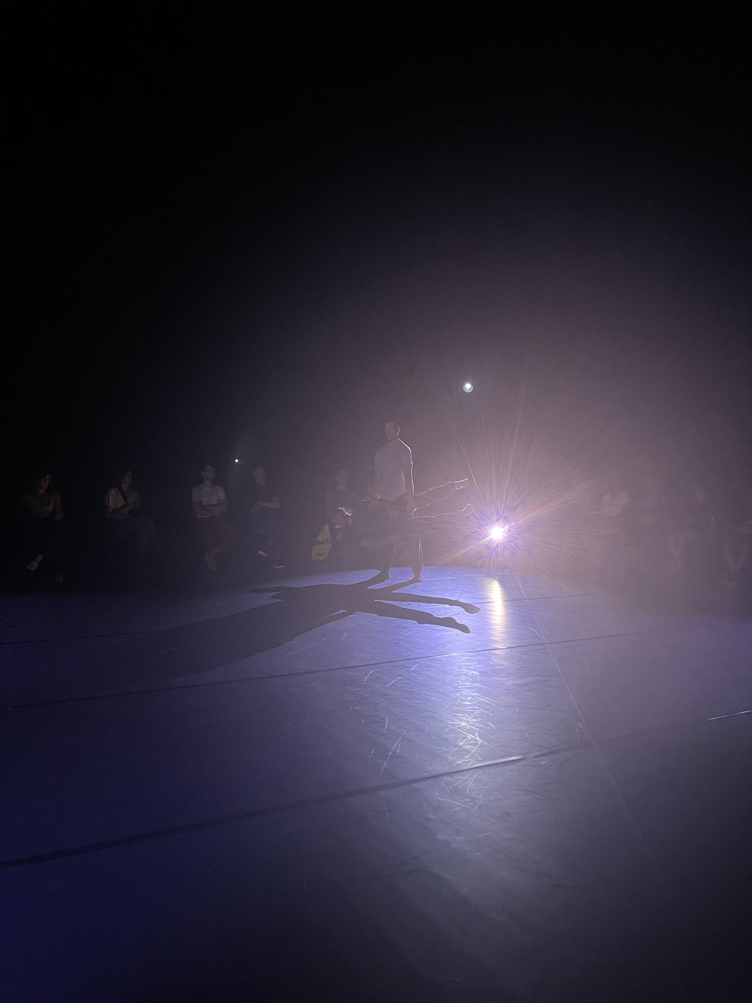 Conceived as a total sensory experience, the piece unfolds as a choreographic triptych (solo, duo, trio), guided by a dramaturgical thread where every movement and every silence resonates like a wave. The quadri-frontal scenography, the immersive play of mobile lights, and the spatialized sound design transform perception, plunging the audience into a universe in constant mutation, unique from each point of view.