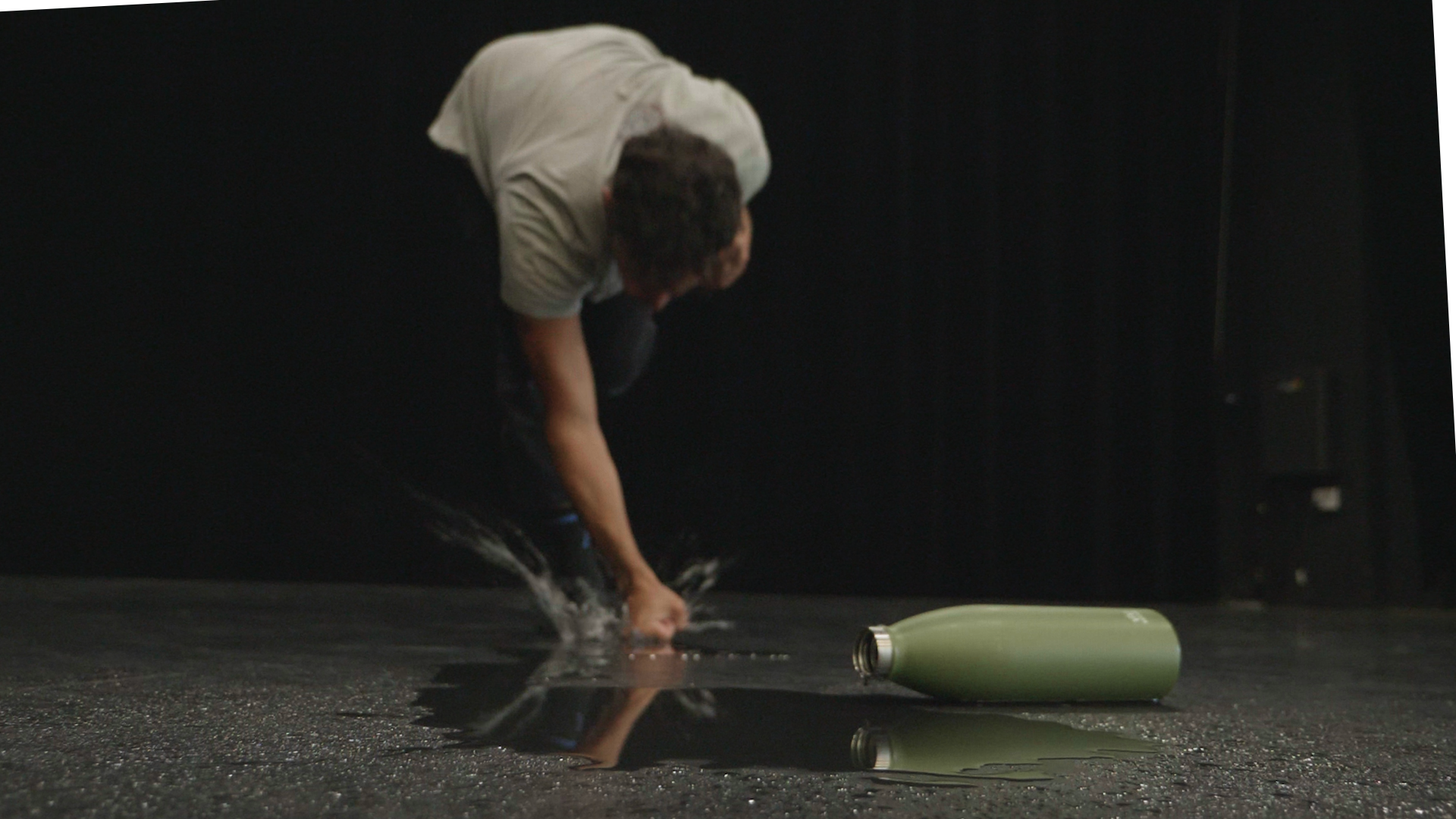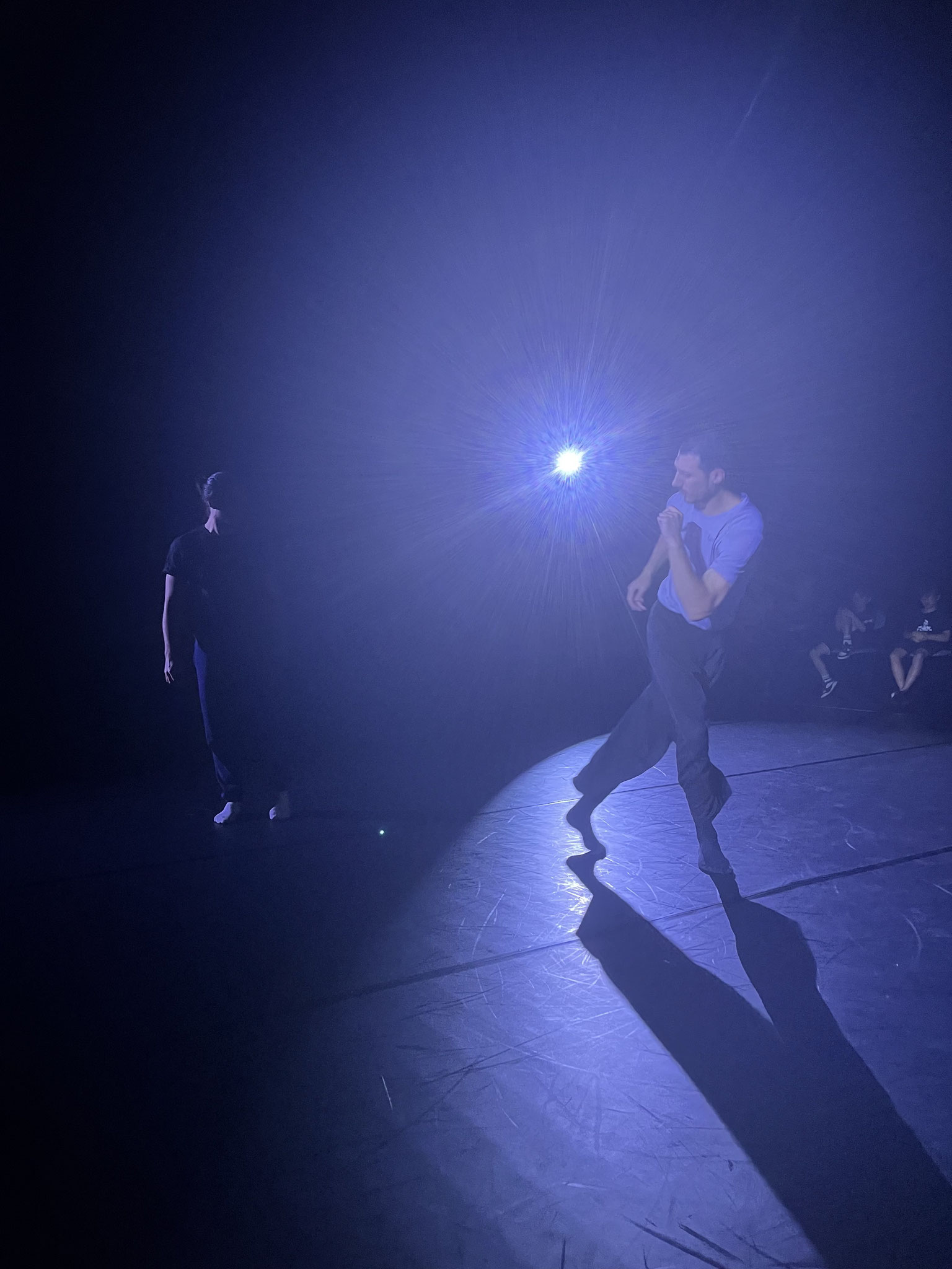 Conçue comme une expérience sensorielle totale, la pièce prend la forme d’un triptyque chorégraphique (solo, duo, trio), traversé par un fil rouge dramaturgique, où chaque mouvement, chaque silence résonne comme une onde. La scénographie quadri-frontale, l’immersion créée par les lumières mobiles et la spatialisation sonore transforment la perception et plongent le spectateur dans un univers en constante mutation, unique selon son point de vue.